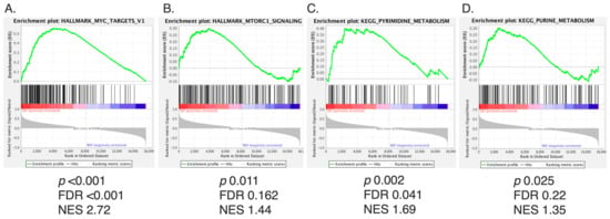mTORC1 Signaling Among Top Gene Sets Enriched in DD LPS. Of the 288 metabolic pathway-related gene sets analyzed by GSEA, the top four ranked gene sets by NES are displayed. Gene sets were analyzed based on enrichment of DD LPS (n = 18) compared to WD LPS (n = 29). p < 0.05 and FDR (q) < 0.25 were used as cutoffs for significance. (A) Hallmark Myc Targets: NES 2.72, FDR < 0.001, p < 0.001, (B) Hallmark mTORC1 Signaling: NES 1.44, FDR 0.162, p = 0.011, (C) KEGG pyrimidine metabolism: NES 1.69, FDR 0.041, p = 0.002, and (D) KEGG purine metabolism: NES 1.35, FDR 0.22, p = 0.025.