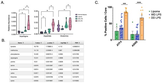 Increased Asparagine Abundance and Upregulated de novo Synthesis in DD LPS. (A) Human LPS samples freshly harvested from surgical resection and stored in liquid nitrogen underwent metabolomic analysis to compare relative abundance of key metabolites. Asn was found to be significantly more abundant among both WD LPS (p = 0.040) and DD LPS (p = 0.019) compared to adjacent normal adipose tissue. Additionally, Asn was significantly more abundant among DD LPS samples compared to WD LPS (p = 0.035). Each dot represents a unique patient sample. (B) Tabular format of metabolite comparisons between WD and DD LPS, ordered by p-value. Listed are the top 10 metabolites that significantly differed between WD and DD LPS. Notably, asparagine was ranked within the top four metabolites. (C) A tissue microarray was used to compare expression of de novo synthesis enzymes, ASNS and ATF4, among lipomatous tumors. IHC staining was quantified by cell positivity per tissue core. DD LPS was found to have significantly higher ATF4 cell positivity compared to WD LPS (p < 0.001) and ASNS cell positivity compared to WD LPS (p < 0.0001). Lipoma is a benign adipose tumor used as a control comparator. Each dot represents a unique patient sample. * p < 0.05, *** p < 0.001, **** p < 0.0001. ns = not significant.