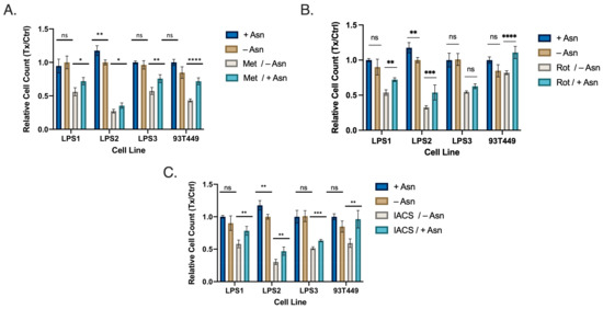 Given that DD LPS displays (1) increased mTORC1 signaling, (2) increased abundance of Asn and (3) increased expression of ATF4 and ASNS, we next explored whether targeting Asn would restrict proliferation in WD/DD LPS. We inhibited the ETC in a panel of WD/DD LPS cell lines using several ETC inhibitors (ETCi) including metformin, rotenone and IACS-010759 (IACS). This was done with or without exogenous Asn supplementation at physiological concentrations. DD LPS cell lines LPS1, LPS2 and LPS3 were previously established at our center [8], and the WD LPS cell line 93T449 was obtained from ATCC. We found that when treated with the combination of ETCi in the absence of exogenous Asn, cell proliferation was significantly impacted in all cell lines investigated (Figure 3A–C). We also observed that in the presence of exogenous Asn, proliferation was partially restored in most instances. This adds to the developing body of literature which argues that the proliferative effects observed from ETCi can be partially explained by the depletion of Asn [11].