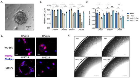 WD/DD LPS PDTOs Display Similar Sensitivity to Asparagine Depletion. PDTOs were generated following patient tumor harvest and grown in pyruvate-free DMEM with 10% v/v dialyzed FBS supplemented with 0.1 mM of Asn (+Asn) or DMSO (−Asn). Organoids were allowed to develop over 3–5 days prior to 72 h treatment with 50 nM IACS. (A) Representative PDTO viewed under light microscopy, scale bar 50 μm. (B) FISH analysis of PDTO’s using MDM2 amplification as a marker of LPS cell validation. Magenta color denotes MDM2 gene. Blue color denotes nuclear staining. Both WD and DD LPS PDTO samples demonstrate high amplification of MDM2, scale bar 20 μm. (C) WD LPS PDTOs, demonstrating combined 50 nM IACS/−Asn therapy, promotes the greatest reduction in organoid growth. LPS053 in particular was found to have a profound sensitivity to combined therapy. Each dot represents a technical replicate. (D) DD LPS PDTOs, demonstrating similar effects across all samples, in which combined IACS/−Asn therapy promotes the greatest reduction in organoid growth. Each dot represents a technical replicate. (E) LPS2 maxi-ring organoids treated with 72 h of 50 nM of IACS or DMSO (+/−Asn) were imaged under brightfield microscopy. Compared to +Asn/DMSO control, -Asn/IACS conditions demonstrated a lower total cell count and attenuated formation of organoid clusters, scale bar 251 μm. * p < 0.05, ** p < 0.01, *** p < 0.001, **** p < 0.0001. ns = not significant.