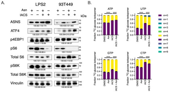 Asparagine Depletion Impairs mTORC1 Activity and Nucleotide Biosynthesis. (A) Western blots of LPS2 and 93T449 lysates 24 h post-treatment of 25 nM of IACS or DMSO in the absence or presence of 0.1 mM of Asn. Lysates were immunoblotted for ASNS, ATF4 and mTORC1 activation markers (pS6K, total S6K, pS6, total S6, p4EBP1). Vinculin was used as a loading control. (B) Fractional contributions of the various U-13C-glucose nucleotide isotopomers following 24 h treatment of 25 nM of IACS or DMSO in the absence or presence of 0.1 mM of Asn. The m + 0 isotopomer denotes lack of incorporation of the U-13C-glucose carbons into the specified nucleotide. The fraction of m+ > 0 denotes the rate of nucleotide biosynthesis. The combination of IACS and −Asn reduced the biosynthesis of all four nucleotides. **** p < 0.0001.