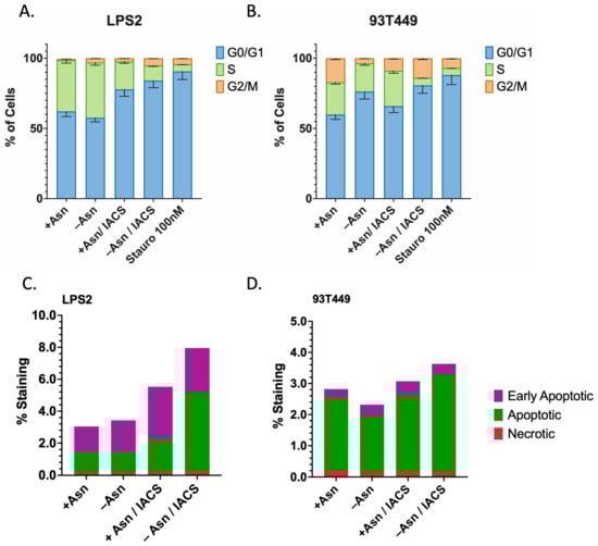 Asparagine Depletion Induces Cell Cycle Arrest and Apoptosis. (A) LPS2 and (B) 93T449 cells were treated with 25 nM of IACS or DMSO in the presence or absence of 0.1 mM of Asn for 24 h, followed by processing for FACS analysis to assess whether combination treatments inhibit cell growth by inducing cell cycle arrest (increasing fraction of cells in G0/G1 phase). A three-hour treatment with Staurosporine 100 nM was used as a positive control for cell cycle arrest. For both LPS2 and 93T449, combination treatment resulted in the highest fraction of cells in G0/G1 phase, indicating that cell cycle arrest does contribute to growth inhibition. This effect is partially reversed in the presence of Asn for both cell lines. (C) LPS2 and (D) 93T449 cells were similarly treated with 25 nM of IACS or DMSO in the presence or absence of 0.1 mM of Asn for 24 h, followed by processing for FACS analysis to assess whether combination treatments inhibit cell growth by inducing apoptosis. For both LPS2 and 93T449, combination treatment resulted in the highest rates of apoptosis, which was partially reversed in the presence of Asn.