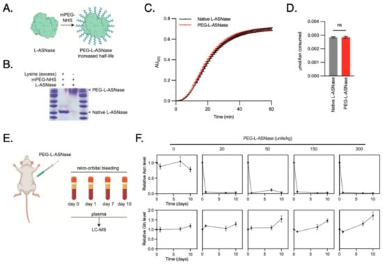 While ASNase was first identified in guinea pig serum, today the drug is primarily synthesized from bacterial sources [24]. Unfortunately, the stability of the drug in its original form is short-lived, requiring daily tail vein injections for murine models. Pharmaceutical companies have overcome this limitation by performing PEGylation to improve its stability. In effect, PEG-ASNase has allowed patients to receive intramuscular injections every 14–21 days rather than intravenous infusions three times a week [25], without therefore synthesized and tested PEG-ASNase for in vivo efficacy in reducing circulating Asn in our mouse models of LPS (Figure 7A). PEG-ASNase was isolated from unmodified ASNase by gel filtration (Figure 7B). PEG-ASNase maintained equivalent hydrolysis activity to unmodified ASNase (Figure 7C,D). Lastly, we assayed the ability of PEG-ASNase to clear plasma Asn in mice (Figure 7E). We found that the lowest effective dose for PEG-ASNase was 20 units/kg, and this resulted in a durable response through 10 days of observation with no measurable effects on Gln levels (Figure 7F). Given that off-target glutaminase activity is a known adverse effect of ASNase [26], we therefore proceeded with this dose of PEG-ASNase.