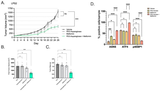 Combination of Metformin and PEG-ASNase Impairs Tumor Growth. (A) LPS2 tumor xenograft growth curves from treatment start date through endpoint. The combination of metformin with PEG-ASNase resulted in significant impairment of tumor growth compared to control (p < 0.0001). (B) Tumor volume at the study endpoint. Each dot represents an individual tumor xenograft. (C) Tumor mass at the study endpoint. Each dot represents an individual tumor xenograft. (D) IHC was performed on formalin-fixed tumor tissue and quantified by cell positivity/sample. Samples were probed for ASNS, ATF4 and the marker of mTORC1 activation (p4EBP1). ASNS and ATF4 positivity was significantly higher in the Met/PEG-ASNase group compared to controls. mTORC1 activity was also attenuated as shown by loss of p4EBP1 staining in the Met/PEG-ASNase group compared to controls. * p < 0.05, *** p < 0.001, **** p < 0.0001. ns = not significant.