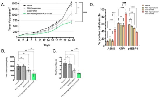 Combination of IACS and PEG-ASNase Impairs Tumor Growth. (A) LPS2 tumor xenograft growth curves from treatment start date through endpoint. The combination of IACS with PEG-ASNase resulted in significant impairment of tumor growth compared to control (p < 0.0001). IACS as monotherapy also resulted in a significant impairment of tumor growth (p < 0.01). (B) Tumor volume at the study endpoint. Each dot represents an individual tumor xenograft. (C) Tumor mass at the study endpoint. Each dot represents an individual tumor xenograft. (D) Quantified IHC of formalin-fixed tumor tissue probed for ASNS, ATF4 and a marker of mTORC1 activation (p4EBP1). ASNS and ATF4 expression was significantly higher in the IACS/PEG-ASNase group compared to controls. p4EBP1 expression was also attenuated in the Met/PEG-ASNase group compared to controls. IACS monotherapy resulted in a loss of p4EBP1, although did not affect ATF4 o ASNS expression. ** p < 0.01, *** p < 0.001, **** p < 0.0001. ns = not significant.