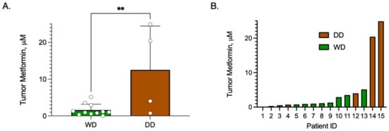 Metformin Concentration in Tumor Samples of Patients taking Metformin. Patients who were taking metformin at the time of surgical resection were included. Metformin concentrations were measured from cryobanked WD/DD LPS tissue samples (n = 15) using MS/LC. (A) Bar graph comparing mean ± SD metformin concentration by histologic group, WD vs. DD, noting that DD displayed significantly higher metformin compared to WD, p = 0.0074. Each dot represents a unique patient tumor sample. (B) Bar graph of tumor metformin concentration from each patient sample, noting high inter-subject variability. ** p < 0.01.