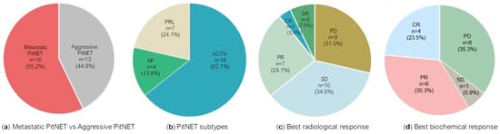 We identified 29 patients with aggressive PitNETs (n = 13) or metastatic PitNETs (n = 16) who had been treated with anti-PD-1 drugs in monotherapy or combined with other non-PD-1 ICIs (Table 1 and Figure 1a). Nine out of the twenty-nine patients were female (31%) and the median age at diagnosis was 43 years. Eighteen patients (62.1%) had an ACTH-secreting PitNET, ten of which were metastatic, and seven patients (24.1%) had a prolactinoma, three of which were metastatic; there were also one aggressive NF-PitNET and three metastatic NF-PitNET cases (Figure 1b).