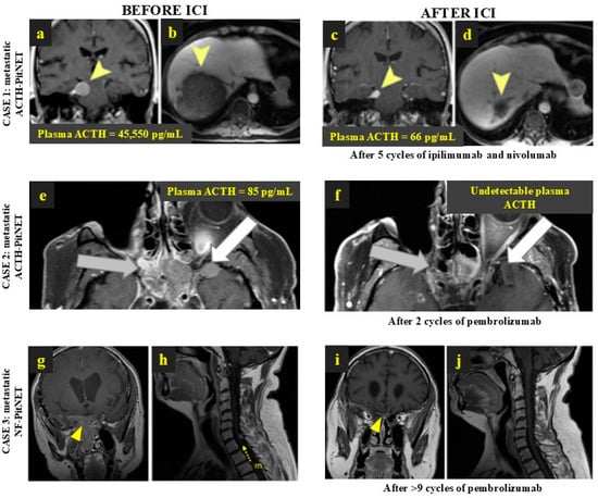 Among ACTH-secreting PitNETs, the radiological benefit after using ICIs was seen in 50% of the metastatic PitNETs (five of ten cases), as well as in 62.5% of the non-metastatic PitNETs (five of eight cases) (Table 3). A partial response following ICI was achieved in four metastatic ACTH-secreting PitNETs (two cases are shown in Figure 2a–f) while the other metastatic cases showed either stable disease (n = 1), progressive disease despite treatment (n = 4), or a dissociated response (n = 1). In non-metastatic ACTH-secreting PitNETs, four cases achieved stable disease, one case had complete involution, and three cases did not respond. The only case in which an outstanding complete response was reported concerned a male with a non-metastatic ACTH-secreting PitNET treated with surgery, radiotherapy, and three cycles of temozolomide prior to the dual therapy with ipilimumab and nivolumab, followed by 10 cycles of nivolumab [].