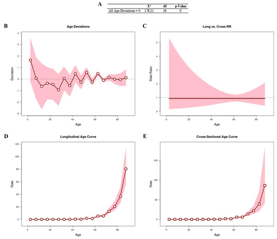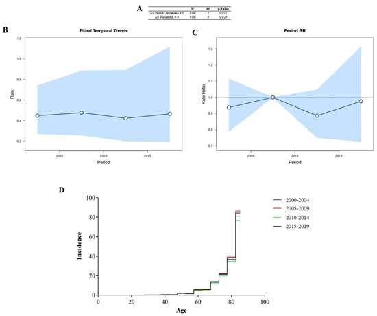 - Rosenberg, P.S.; Check, D.P.; Anderson, W.F. A Web Tool for Age–Period–Cohort Analysis of Cancer Incidence and Mortality Rates. Cancer Epidemiol. Biomark. Prev. 2014, 23, 2296–2302. Available online: https://aacrjournals.org/cebp/article/23/11/2296/14669/A-Web-Tool-for-Age-Period-Cohort-Analysis-of (accessed on 4 July 2024). [CrossRef] [PubMed]