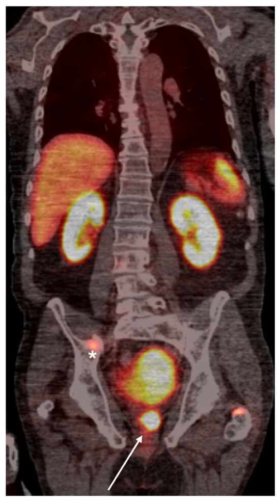 Whole-body PSMA PET scan demonstrating a primary lesion in the left prostate gland (arrow), with evidence of osseous metastasis in the pelvic bones (asterisk).