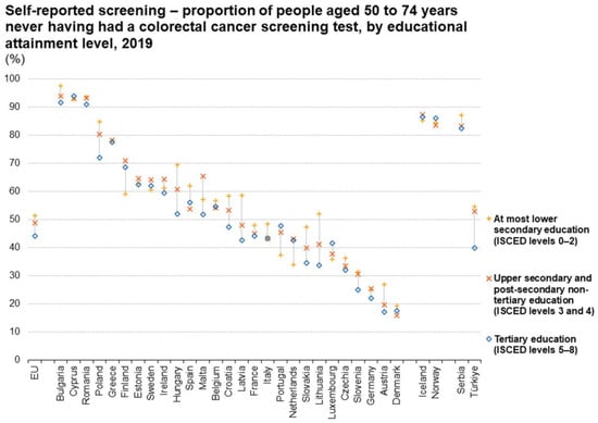 Increased adherence to screening is significantly related to the implementation of organized programs. Considering only screening for colorectal cancer, the rate of participation in screening programs differs significantly across European countries. The lowest participation is observed in countries in which organized, population-based screening programs are not yet implemented. In 2019, 49% of people aged 50 to 74 reported that they had never attended screening for colorectal cancer, with a lack of participation as high as 94% in some countries and as low as 17% in others (Figure 2). The incidence of colorectal cancer has decreased significantly in the last years (2000–2017) in countries with long-standing screening programs and widespread population coverage, while it either remained stable or increased in countries with no large-scale screening programs (Supplementary Table S3).