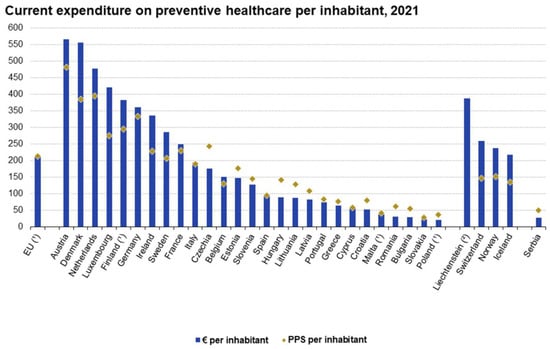 Expenditure for preventive care, education, and counseling in Europe (2012–2020). The higher the level of expenditure for preventive care, education, and counseling, the higher the adherence rates to cancer screening.