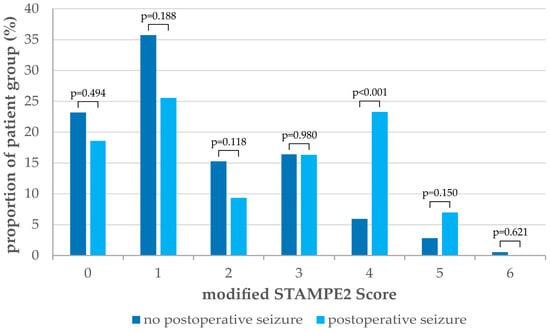 Distribution of the modified STAMPE2 score in patients with postoperative seizures (N = 43) compared to patients with no postoperative seizures (N = 353). Scores of seven and eight were not achieved in the study population.