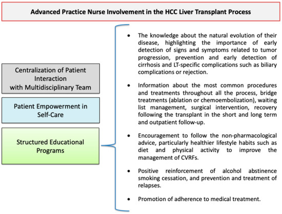 In summary, APNs play a specific role in the management of all phases of patients’ journeys, which are based on therapeutic education, counseling, and support. These interventions are targeted to empower patients to acquire knowledge, skills, and attitudes to effectively manage liver cancer and the LT process.