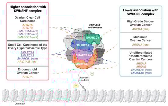 Here, we focus on SWI/SNF complex member genes and their proteins, that are either mutated or themselves epigenetically regulated in rare subtypes of ovarian cancer. Specifically, we will review SMARCA4, SMARCA2, SMARCB1, SMARCC1, ARID1A and ARID1B. SMARCA4 (SWI/SNF-Related, Matrix-Associated, Actin-Dependent Regulator of Chromatin, Subfamily A, Member 4) and SMARCA2 (SWI/SNF-Related, Matrix-Associated, Actin-Dependent Regulator of Chromatin, Subfamily A, Member 2) are mutually exclusive ATP-dependent helicases that are present in all of cBAF, PBAF and ncBAF. These catalytic subunits are critical to chromatin remodelling, requiring ATP hydrolysis to enable nucleosome sliding and histone eviction, modulating access to DNA [,,].