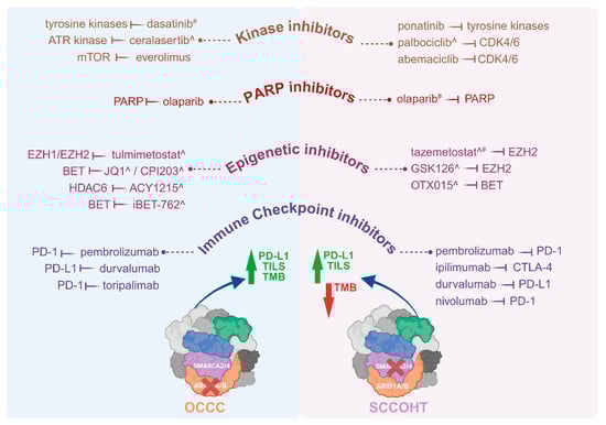Subunits of the SWI/SNF complex are differentially mutated in distinct ovarian cancer subtypes. For example, ARID1A is frequently mutated in OCCC and endometrioid ovarian cancer (EnOC) but rarely mutated in HGSOC and mucinous ovarian cancer (MOC) [,,,]. ARID1B, the mutually exclusive paralogue of ARID1A, is mutated in OCCC []. Both ARID1A and ARID1B are rarely mutated in SCCOHT []. Interestingly, ARID1A is mutated in the benign condition endometriosis, with OCCC and EnOC described as endometriosis-associated ovarian cancers (EAOC) [,,,]. SMARCA4 is the predominant SWI/SNF complex member mutated in SCCOHT, with mutations reported infrequently in OCCC and HGSOC [,,]. Other subunits of SWI/SNF, specifically SMARCA2, SMARCB1 and SMARCC1, are reported to be mutated at very low frequency in OCCC or SCCOHT [,,]. The abrogation of SWI/SNF complex members is not only governed by genetic mutation, as SMARCA2 can be post-translationally silenced in SCCOHT [] and more rarely in OCCC [,]. Mutations and epigenetic silencing of SWI/SNF complex members present therapeutic vulnerabilities, facilitating synthetic lethal approaches for the treatment of ovarian cancer [,]. Mutated or epigenetically silenced SWI/SNF subunits in ovarian cancer are depicted in Figure 1.
