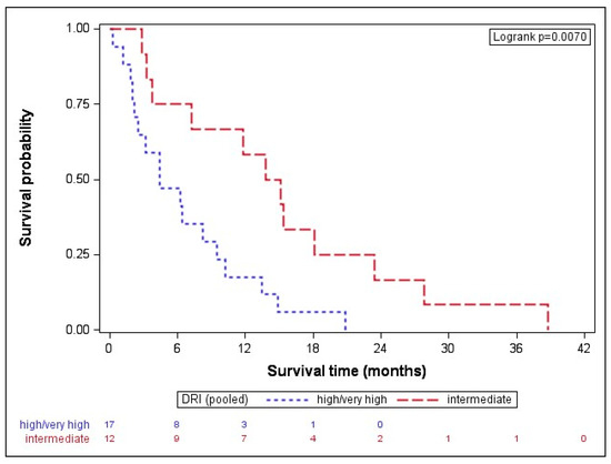 When dividing the results by disease type, the median OS in AML was 8.0 (IQR: 2.4–15.1) months, while MDS patients had a median OS of and 7.2 (IQR: 3.3–13.8) months. While the disease type (p = 0.795) did not seem to impact on the outcome after AZA/DLI, the disease stage before transplant showed a clear trend. Patients in CR before transplant (n = 19) had a longer median OS with 11.8 (IQR: 2.8–18.1) months than patients with active disease (n = 10), formally SD or progressive disease (median OS of 6.4, IQR: 4.5–9.6 months, p = 0.061). Given that clear statistical significance failed, probably due to the small size of the subgroups, next, we pooled together very high and high DRI-scored patients and compared their OSs with intermediate DRI patients [22]. The high-/very high-risk subgroup had a statistically significantly shorter OS with 4.4 (IQR: 2.2–9.5) months than intermediate-risk patients with a median OS of 14.5 (IQR: 5.5–20.8) months, p = 0.007 (Figure 1).