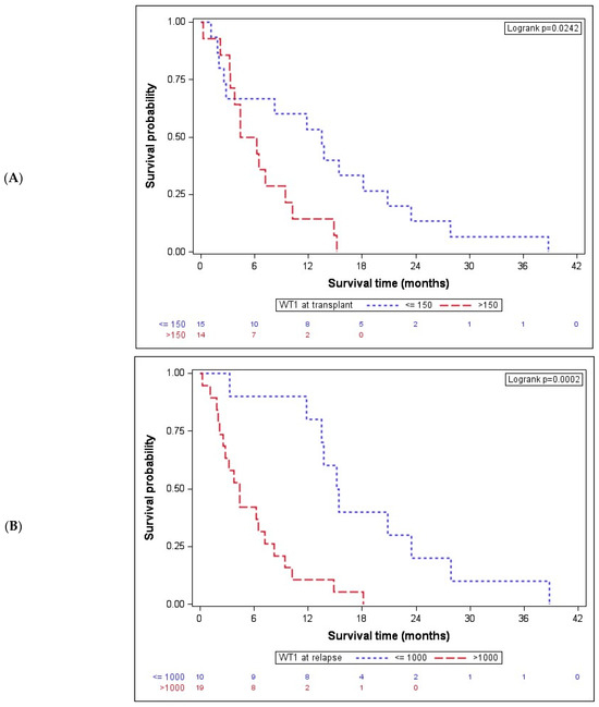 Given that WT1 expression at transplant was shown to be associated with OS after AZA/DLI, next, WT1 expression at time of post-transplant relapse was analyzed. Again, the same model for the cut-off determination, which maximized the log-likelihood of the regression model with a cut-off value of WT1 ≤ 1000 copies (HR 5.4, CI95 2.0–14.2), was applied. In fact, dividing the patients on the basis of the WT1 copy number at relapse resulted highly significant in terms of OS. Patients (34.5%) with ≤1000 WT1 bone marrow copies at time of relapse had a significantly longer OS with 15.3 (IQR: 13.5–23.4) months than (65.5%) patients overexpressing WT1 (>1000), with an OS of 4.4 (IQR: 2.2–8.3) months, p = 0.0002 (Figure 2B).