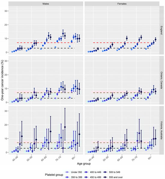 Cancer incidence following thrombocytosis In England, Canada, and Australia for female and male patients, stratified by age group and platelet count group. Black dashed link: 3% risk threshold. Red dashed line: 7% risk threshold.