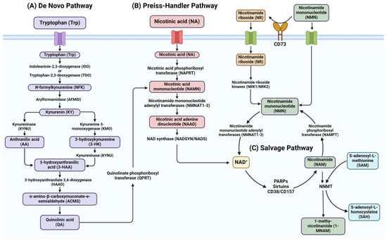 NAD+ biosynthesis pathways. NAD+ is synthesized through three different pathways, the de novo, Preiss–Handler, and salvage pathways. (A) The de novo pathway is the longest pathway, utilizing tryptophan (Trp) to produce quinolinic acid (QA) through a reaction cascade that feeds into the Preiss–Handler pathway. (B) The Preiss–Handler pathway converts nicotinic acid (NA) that has come from a dietary source into NAMN via NAPRT, which is then converted to NAAD by NMNAT enzymes allowing for the final step of forming NAD+ through NADSYN. (C) The NAD+ salvage pathway uses NAM, a product of enzymatic NAD+ consumption, back into NAD+ with NAMPT, regulating the rate limiting reaction in the process. Created with BioRender.com accessed 3 September 2024.