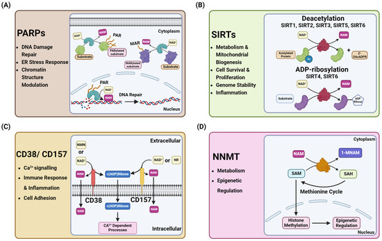 NAD+ acts as a crucial cofactor in metabolic processes and is also required for several enzymatic reactions. Most notably, NAD+ is reduced to NADH or NAD+ to NADPH in several reactions during glycolysis and oxidative phosphorylation [31]. These reactions themselves are indicative of the pertinence of these redox couples in maintaining cellular metabolism and redox homeostasis. Yet, the NAD+ levels in cells are often regulated by its consumption through enzymatic cleavage to produce NAM, which is subsequently shuttled into the NAD+ salvage pathway to resynthesize NAD+ [32]. The predominant consumers can be categorized into four classes: poly (ADP-ribose) polymerases (PARPs), Sirtuins (SIRTs), CD38 and CD157 (two cADP-ribose synthases (cADPRs)), and nicotinamide N-methyltransferase (NNMT) (Figure 1C and Figure 2) [13]. These enzymes utilize NAD+ in order to maintain various cellular signaling pathways that include but are not limited to DNA repair, the inflammatory response, and post-translational modifications [20].