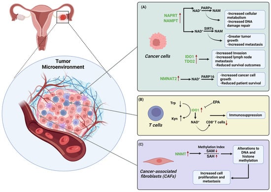 Summary reaction schemes depicting the influence NAD+ biosynthesis pathway reactions on the tumor microenvironment (TME). The TME often consists of (A) cancer cells, (B) T cells, and (C) cancer-associated fibroblasts. The interaction between NAD+-consuming enzymes and different cell types in the TME regulates various processes including tumorigenesis, progression, and metastasis in gynecologic cancers. Thus, the way NAD+ levels are maintained, in addition to the activity of the biosynthesis pathways, will trigger various processes in the context of the gynecological cancer tumor environments. Note. “↑” indicates “increase in expression” and “↓” indicates “decrease in expression levels”. Created with BioRender.com accessed 22 August 2024.