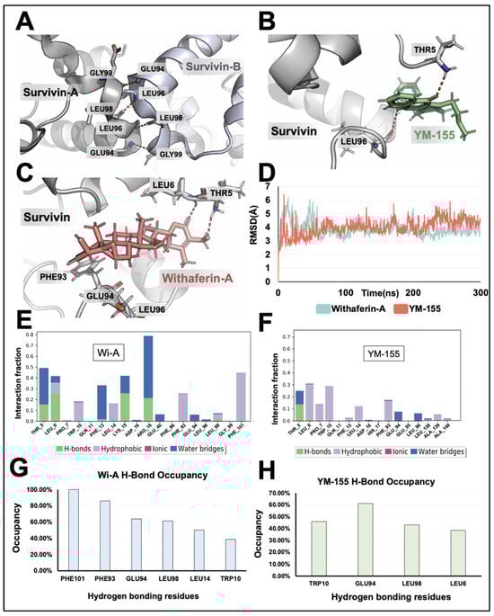 Computational analysis reveals Survivin inhibition by Withaferin-A and YM-155. (A) Visualization of the interaction between homodimers of Survivin involving amino acid residues Gly99, Leu98, Leu96, and Glu94. (B) Visualization of the interaction between YM-155 and the Survivin homodimer-forming region; the interaction of YM-155 with Thr5 and Leu96 is seen. (C) Visualization of the interaction between Wi-A and the Survivin homodimer-forming region; the interaction of Wi-A with Thr5 is seen. (D) Root means square deviation plot of the simulations for YM-155 and Wi-A interactions with Survivin. (E,F) Interaction fraction diagrams of Wi-A (E) and YM-155 (F) over the simulation were obtained using Schrodinger simulation analysis. (G,H) Hydrogen bond occupancy plot of Wi-A (G) and YM-155 (H) with Survivin obtained using VMD analysis.