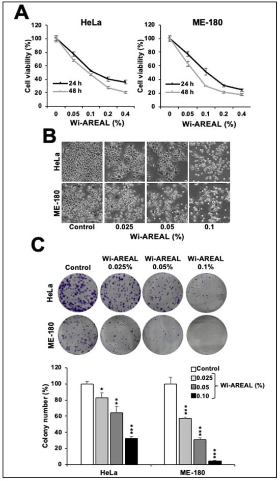 Cells were subjected to Wi-AREAL (0.025%, 0.50%, and 0.1%) for ~10 h, followed by culture in normal medium for 10–15 days with regular medium changes on every third day. As shown in Figure 2C, Wi-AREAL-treated cultures of both cell lines showed a decrease in the colony number and the size of colonies. Consistent with the cell viability data, a dose-dependent decrease in colony formation was observed. HeLa cells showed a ~20, 40, and 70% reduction in colony number in cultures treated with 0.025, 0.0%, and 0.1% Wi-AREAL, respectively. Wi-AREAL-treated ME-180 cells showed a more substantial effect (~40, 70, and 95% reduction in colony number (Figure 2C)).