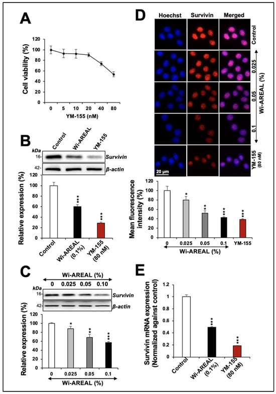 To investigate the involvement of Survivin in Wi-AREAL-induced cytotoxicity, we compared its effect with that of YM-155, an established inhibitor of Survivin that has been shown to downregulate its mRNA and protein expression. The dose-dependent viability assay showed a 20 and 50% decrease in cultures treated with 40 and 80 nM YM-155 (Figure 3A). Based on these data, 80 nM YM-155 was used parallel to 0.1% Wi-AREAL extract. HeLa cells treated with Wi-AREAL showed a reduction in Survivin protein (Figure 3B). Furthermore, an apparent dose-dependent decrease in Survivin was observed both in the Western blot (Figure 3C) and immunostaining (Figure 3D) assays. Notably, similar to the YM-155-treated cells, Wi-AREAL-treated cells showed a decrease in Survivin mRNA (Figure 3E), suggesting that Wi-AREAL may work similarly to YM-155.