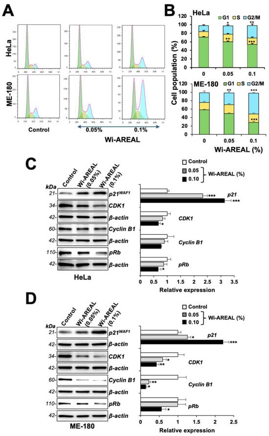 Next, we performed a cell cycle analysis of the control and Wi-AREAL (0.05 and 0.1%) -treated cells. As shown in Figure 4A,B, the treated cells showed an increase in cell population in the G2-M phase consistent with the reduction in Survivin, as shown in Figure 3. Of note, a dose-dependent increase in the G2-M population was recorded in both cell lines. Furthermore, 0.1% Wi-AREAL-treated ME-180 cells showed a higher number of cells arrested in the G2-M phase as compared to HeLa cells, and this was consistent with the more substantial reduction in colony number in ME-180 shown in Figure 2C. The biochemical analysis of molecular markers involved in cell cycle progression revealed a dose-dependent increase in p21WAF1 and a decrease in CDK1, cyclin B1, and pRB proteins in cells treated with Wi-AREAL. The data were consistent with G2-M arrest in both cell lines and showed a more substantial effect on ME-180 than on HeLa cells (Figure 4C,D).