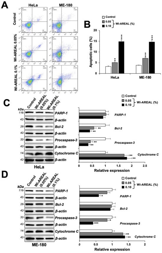Microscopic observations of control and Wi-AREAL-treated cells of both cell types showed a rounded apoptotic morphology, as shown in Figure 2B. Hence, we next performed flow cytometry analysis for apoptosis. As shown in Figure 5A,B, both cell lines showed a dose-dependent increase in apoptotic cells upon treatment with Wi-AREAL (0.05 and 0.1%). Furthermore, biochemical analyses of proteins involved in apoptosis revealed a dose-dependent decrease in procaspase-3 and an increase in Cytochrome C in both cell lines (Figure 5C,D). Wi-AREAL-treated HeLa and ME-180 cells showed no significant change in PARP-1 and Bcl-2, respectively. Taken together, these data demonstrated the occurrence of growth arrest and apoptosis in Wi-AREAL-treated cancer cells.