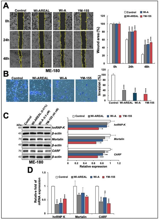 Effect of a low dose of Wi-AREAL on cell migration and invasion characteristics. ME-180 cells treated with Wi-AREAL showed a decrease in cell migration (A) and invasion (B) comparable to that in cells treated with either Wi-A or YM-155. Quantitation from three independent experiments is shown on the right (mean ± SD, n = 3), *** p < 0.001 (Student’s t-test). The treated cells showed decreased hnRNP-K, mortalin, CARF proteins (C), and mRNA (D) (mean ± SD, n = 3), * p < 0.05, ** p < 0.01, *** p < 0.001 (Student’s t-test).