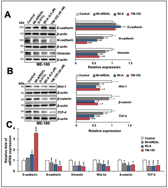 We also examined the expression of proteins involved in EMT in control and Wi-AREAL (0.01%) -treated HeLa cells. Consistent with the decrease in migration and invasion potential of Wi-AREAL-treated cells, as shown in Figure 6, we found an increase in E-cadherin (Figure 7A). Wi-A-treated cells showed a significant increase; Wi-AREAL- and YM-155-treated cells showed a minor and inconsistent increase. On the other hand, N-cadherin and Vimentin showed a significant decrease (Figure 7A) in cells treated with either of the three (Wi-AREAL, Wi-A, and YM-155) groups. The analysis of Wnt-1, β-catenin, and TCF-4 also showed a reduction in treated vs. control cells (Figure 7B). Of note, the effect of Wi-AREAL on Wnt-1 and TCF-4 proteins was quantitatively similar to that of the two positive controls, Wi-A and YM-155. On the other hand, Wi-AREAL-treated cells showed a small and insignificant decrease in β-catenin. The effect was also detected at the transcript level. As shown in Figure 7C, YM-155- and Wi-A-treated cells showed a significant increase in E-cadherin mRNA. Wi-AREAL-treated cells showed a small and insignificant increase. These results were consistent with the protein expression data shown in Figure 7A. On the other hand, a decrease in N-cadherin, Vimentin, Wnt-3a, β-catenin, and TCF-4 in Wi-AREAL-treated cells was quantitatively matched to that in the Wi-A and YM-155 positive controls (Figure 7C). Taken together, these data demonstrated that Wi-AREAL caused a reduction in the migration and invasion characteristics of cancer cells through the inhibition of EMT signaling, similar to its purified active component (Wi-A), as well as YM-155, an established Survivin inhibitor.