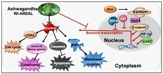 Survivin is considered a powerful, unique target for cancer therapy due to its well-established multiple functions in regulating the cell division, apoptosis, stress, stemness, and drug response of cancer cells [63,64,65]. Wi-A, on the other hand, has recently been shown to possess anti-inflammatory, antiherpetic, antifibrotic, immunosuppressive, and anticancer potentials that operate through multiple targets and molecular pathways [31,32,33,36,59,66,67]. We used Wi-A and Wi-AREAL and demonstrated their Survivin-targeting activity, promoting apoptosis and inhibiting metastatic properties in cancer cells through multiple pathways (Figure 8), suggesting their place in the expanding list of molecular inhibitors of Survivin [68].