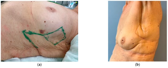 For limited defects, it is also possible to replace the volume and fill the cavity created by the tumor resection using a local flap. Local flaps can be taken from the epigastrium, the lateral thoracic wall and the back. Standard flaps are the perforator-based flaps from the intercostal system [,,,]. The advantage of these flaps is that they are mobile and can be transposed around the perforator vessels []. The disadvantage, however, is that the perforators must first be identified using at least a Doppler or ultrasound examination, and flap dissection requires microsurgical expertise. Additionally, arterial and/or venous perfusion might not be sufficient to ensure flap viability in all flap regions, especially in the distant parts. The complication rate for these flaps is high, with an overall complication rate between 7% and 37.8% and a reoperation rate of 11% [,,]. In case complications occur, adjuvant radiotherapy has to be postponed []. When these flaps are buried, fat necrosis that occurs due to reduced perfusion or venous congestion is not visible or initially recognized but can manifest itself after radiotherapy. Therefore, the complication rate might be underestimated.