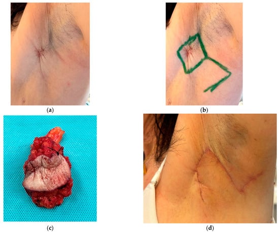 - Altmann, S.; Fansa, H.; Schneider, W. Surgical treatment of axillary hidradenitis suppurativa. Chirurg 2001, 72, 1413–1416. (In German) [Google Scholar] [CrossRef] [PubMed]