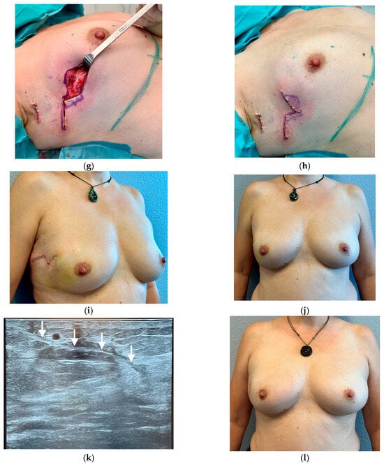 53-year-old patient with invasive breast cancer on the right breast. (a) Preoperative view with firm breast. (b) Wire marking and delineation of tumor borders. Tumor size: 3.5 × 4 cm. (c) The tumor is resected via a direct incision in this case. No skin resection is necessary. The flap is planned as a rhombus. The pedicle is placed cranially and dorsally. (d) Resected specimen; tumor weight is 85 g. (e) After tumor resection, the flap is incised in all layers. White star indicates the parenchymal defect after tumor resection. (f) Volume and NAC position are evaluated in the seating position with the flap temporarily fitted. Marking of the buried area of the flap. (g) Deepithelialization of the inferior, buried part of the flap. Fixation of the flap with Vicryl 3-0. (h) Immediately after wound closure, using Monocryl 4-0 intracutaneously. Drains are not necessary. (i,j) illustrate two weeks after surgery. Volume appears symmetrical, and NAC is in the right position, despite the large resection. (k,l) show results four months after surgery and eight weeks after radiation therapy. The ultrasound (k) shows no dead space/cavity or necrosis. The flap has healed well. The white arrows show the anterior deepithelialized buried part of the flap. The frontal view shows a symmetrical result and no NAC dislocation after radiation therapy.