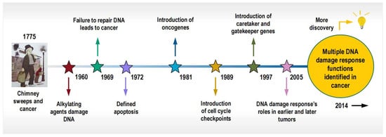 Timeline of findings related to the DNA damage response that led to the somatic mutation theory of cancer. Reproduced from Huang and Zhou [].