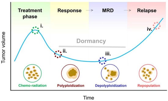 Preclinical studies have identified four phases of solid tumor therapy following exposure to ionizing radiation (e.g., []) and chemotherapeutic drugs (e.g., cisplatin [,]) that are consistent with common trends in patient outcomes []. These phases are outlined below. Figure 3 is adapted from a comprehensive review on polyploidy/neosis by Zhao et al. [] and a recent report by that group [] in which they determined the basis for the minimal residual disease (MRD) in the course of radiotherapy. The cartoons showing cell images are redrawn from the time-lapse microscopy data presented in the latter article (see Figure 3B in []).
