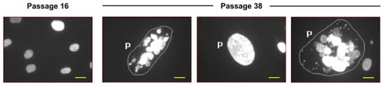 Fluorescence images showing the nuclear morphology of 2800T (Li-Fraumeni syndrome) dermal fibroblasts at different passage numbers. P, polyploid/multinucleated giant cells. Scale bars, 50 µm. Reproduced from Mirzayans et al. [] with permission.