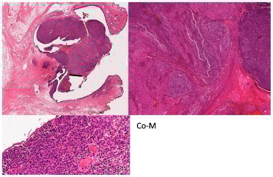 Clinically, Co-M most often presents in the bulbar conjunctiva, near the limbus, but can affect any part of the conjunctiva and even invade the neighbouring structures in advanced cases [4,22]. Lesions vary from amelanotic to brown pigmented or even black in colour. There is no standardised treatment; however, management includes surgical excision +/− adjuvant cryotherapy, topical chemotherapy, brachytherapy, proton beam radiotherapy or photon external beam radiation and, in advanced cases with local tissue invasion, radical orbital exenteration [18,22,23,24,25,26,27]. Postoperative complications and tumour recurrence rates are high (33–45%), warranting life-long follow-up [4,28,29,30,31]. Metastases to the lymph nodes are common (~25%) but may also involve the liver, lungs and brain, with ~27% 5-year disease-specific mortality rates [32,33].
