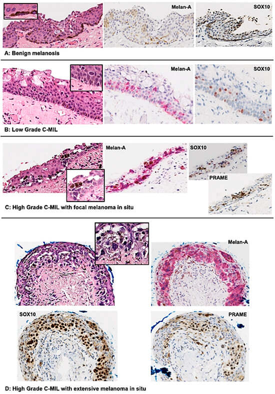 All conjunctival melanocytic lesions immunohistochemically show MelanA (MART1), S100, SOX10, HMB45 (the latter should only be present in superficial areas of naevi) and MITF (Melanocyte Inducing Transcription Factor). Nuclear expression of PRAME (Preferentially expressed Antigen in Melanoma), cyclin D1 positivity and loss of p16 on immunohistochemistry can also be helpful in distinguishing Co-M from naevi or low-grade C-MIL (both PRAME and cyclin D1 negative, p16 positive) [57,88,93,94,95,96]. PD-L1 may be expressed [97].