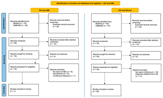 A detailed and comprehensive systematic literature review disclosed 28 studies which collectively describe 33 patients with OD affected by brain gliomas [3,8,18,19,20,21,22,23,24,25,26,27,28,29,30,31,32,33,34,35,36,37,38,39,40,41,42] and only 1 study reporting one case harboring OD and acute myeloid leukemia [6] (Figure 1). In addition, we reported a single case of a patient with OD who simultaneously experienced both a brain glioma and acute myeloid leukemia.