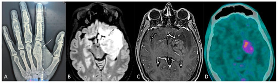 (A) Radiograph of the left hand: enchondroma affecting the first metacarpal bone (white arrow). (B,C) Preoperative brain MRI, axial slices, (B) fluid-attenuated inversion recovery (FLAIR), and (C) contrast-enhanced sequences. (D) PET-CT scan.