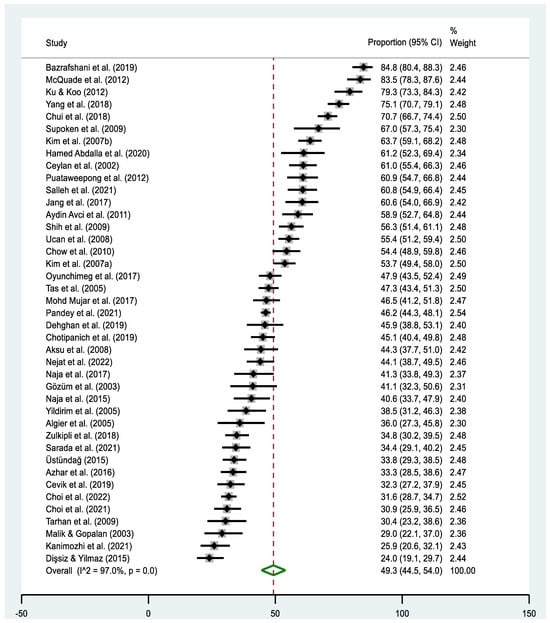 The subgroup analysis, based on whether a sample size calculation was provided, the data collection method, and income level revealed that the highest utilization of T&CM was observed among groups where a sample size calculation was not provided (49.6%, 95% CI: 44.3–54.9%) [45,46,51,57,62,66,74,78], those using self-completed questionnaires (53.6%, 95% CI: 38.0–68.9%) [47,48,52,56,58,69,71,76], and high-income countries (53.3%, 95% CI: 44.5–62.0%) [47,60,72,73,78,79]. However, there were no significant differences in the prevalence of T&CM use based on these variables.