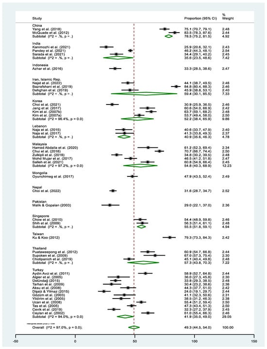 Forest plot of the pooled prevalence estimates of T&CM use among cancer patients in individual Asian countries. The black diamond dots represent the individual prevalence from each study, with the horizontal lines representing the 95% CI. The green rhombus and the red dashed line denote the pooled prevalence estimate and its 95% CI. Sub-groups with (I2 = . %, p = .) indicate that the number of studies were too few for the estimates to be calculated.