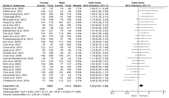 We examined whether the prevalence of T&CM use varies by gender. Five studies did not report the prevalence of T&CM use by gender [45,49,56,65,80]; so, thirty-six studies were included in this analysis. The pooled prevalence estimate in the combined sample was 50.2% for males (95% CI: 44.3–56.0%) and 52.3% for females (95% CI: 46.3–58.2%) (Table 2). The difference in utilization of T&CM between males and females was analyzed using 27 comparable datasets [46,47,48,50,51,52,53,54,55,58,60,62,63,67,68,69,70,71,72,73,76,77,78,79,81,83,85]. Females were 22% more likely to use T&CM than males (OR = 1.22, 95% CI: 1.07–1.39%, p = 0.002; I2 = 50%) (Figure 4).
