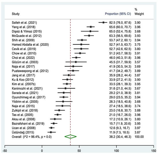 A total of twenty-six studies [46,48,50,52,53,54,58,59,60,62,63,65,66,67,68,69,70,72,73,76,77,79,81,83] reported the disclosure rate of T&CM use among cancer patients (Table 2, Figure 5). The pooled prevalence estimate of disclosing T&CM use among cancer patients was 38.2% (95% CI: 30.4–46.3%), ranging from 11.9% [67] to 82.5% [50], with a large amount of heterogeneity (Χ2 = 703.5, p < 0.001; I2 = 96.4%). When examining different regions, the highest estimate of disclosing T&CM use was observed in the Southeast Asian region (51.1%, 95% CI: 34.6–67.4%), while the lowest estimate was found in the Western Asian region (29.0%, 95% CI: 20.1–38.7%). The pooled prevalence estimates of disclosing T&CM use were higher in studies conducted since 2014 (42.9%, 95% CI: 30.7–55.6%), with sample sizes below 300 (43.2%, 95% CI: 33.2–53.5%), and in high-income countries (43.5%, 95% CI: 33.0–54.3%). However, no significant heterogeneity was observed in the studies included in the subgroup analyses.