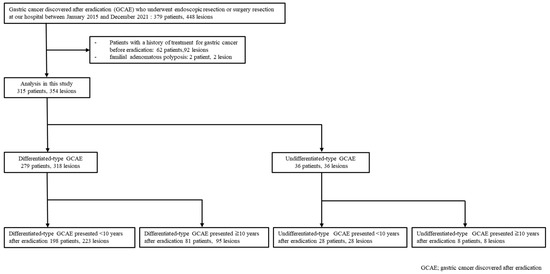 We retrospectively assessed 379 patients with 448 GCAE lesions who underwent endoscopic resection or surgery at the Hiroshima University Hospital between January 2015 and December 2021. Among these cases, 62 patients with 92 lesions who had undergone gastric cancer treatment before eradication and two patients with familial adenomatous polyposis (FAP) were excluded from the study. Finally, 315 early gastric cancer (EGC) cases with 354 lesions (230 males and 85 females; mean age, 70 years) were included in this study (Figure 1). The median follow-up was 5.2 years (range: 2.4–11.9 years). The patients were divided into two groups: Differentiated-type GCAE (D-GCAE: 279 patients, 318 lesions) and undifferentiated-type GCAE (UD-GCAE: 36 patients, 36 lesions). For D-GCAE, we compared the characteristics of GCAE that presented within 10 years after eradication (198 patients, 223 lesions) with those that presented >10 years (81 patients, 95 lesions). For UD-GCAE, we also compared the characteristics of GCAE that presented within 10 years of eradication (28 patients, 28 lesions) with those that presented >10 years (8 patients, 8 lesions; Figure 1).