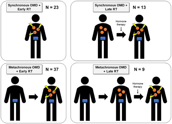 Patient subgroups by type of OMD and timing of OMDRT in this study. The orange figure represents OMD lesions, and the blue figure represents the primary prostate tumor. The yellow figure indicates that radiotherapy is being administered to each OMD lesion.